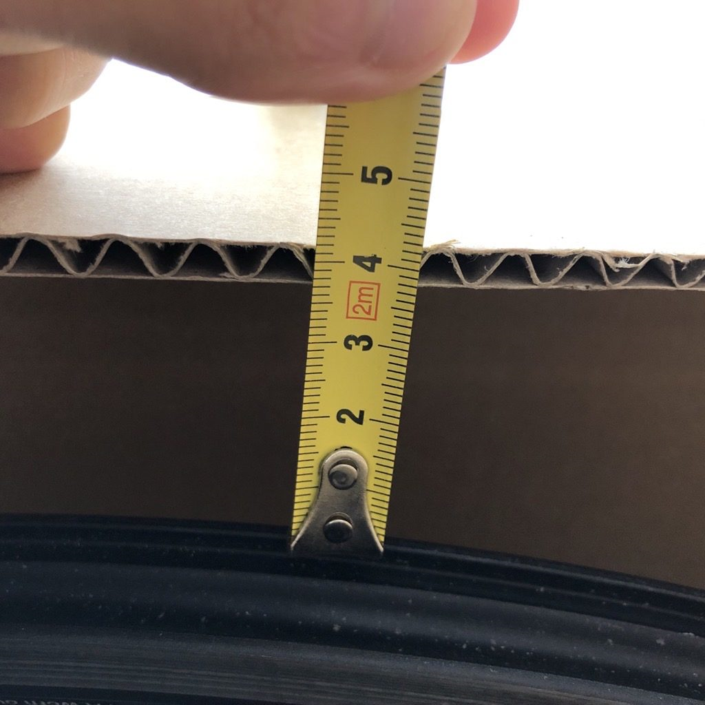 ダンボールを閉めるとホイール上面とダンボールとの隙間は40mm弱くらいなので、梱包材を入れればいい感じのぴったり具合です。