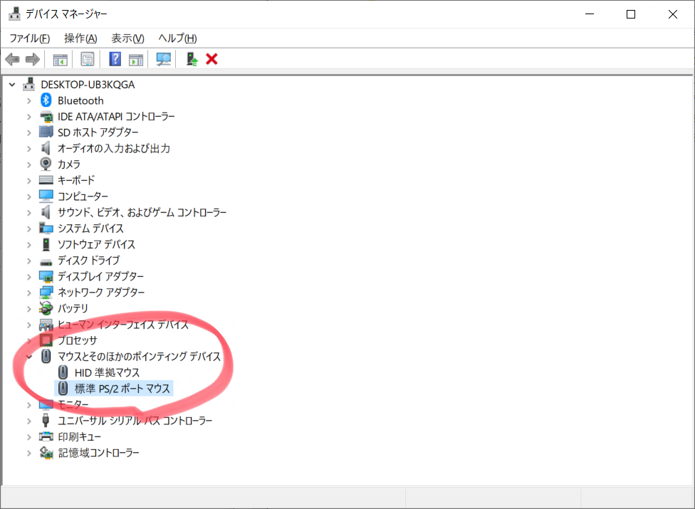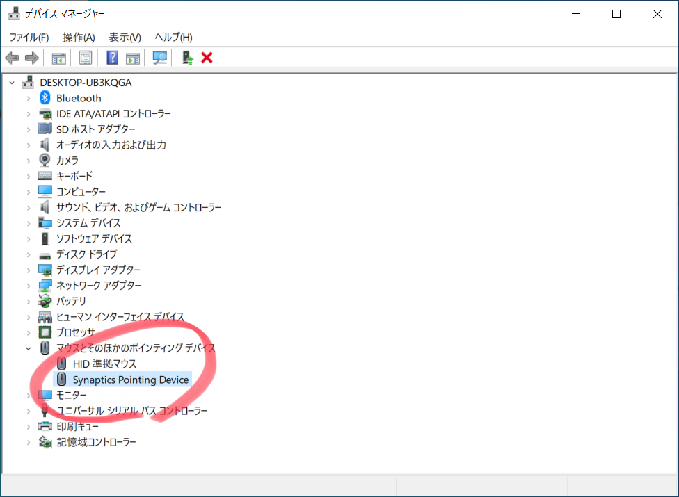 再起動後、再びデバイスマネージャーを見ると、標準PS/2ポートマウスがSynaptics Pointing Deviceに変わっていることがわかります。
