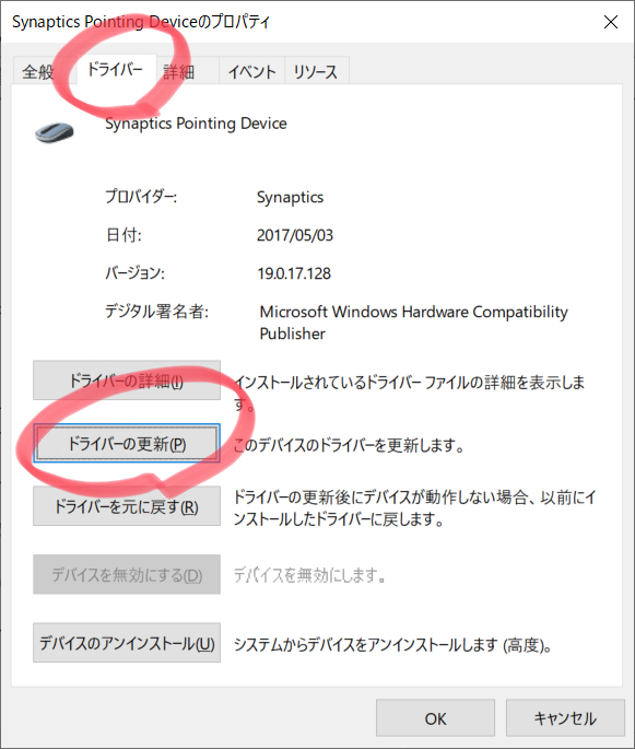 ドライバー タブを開き、ドライバーの更新(P)を開きます。※画像がすでにSynaptics Pointing Deviceとなっていますが、ドライバーを当てたあとにこのスクショをとったためです。