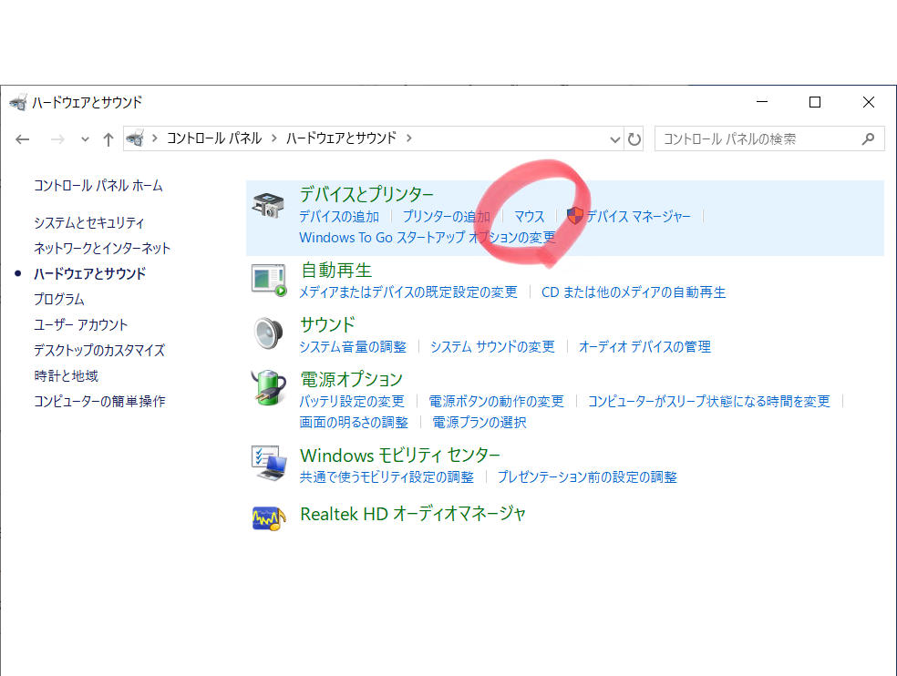 コントロールパネルでハードウエアとサウンドをクリックします。