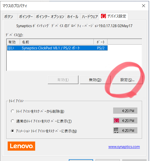 デバイス設定のタブがSynapticsになっています。設定 をクリックします。