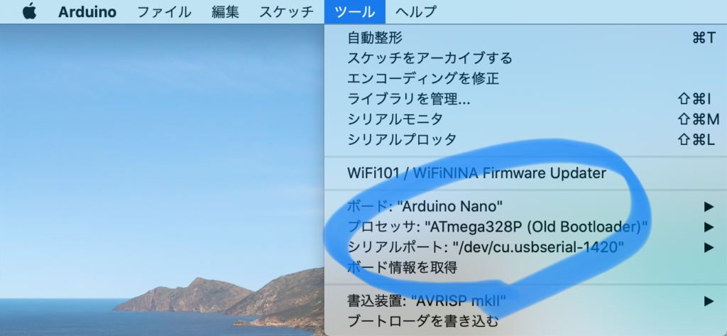 具体的には、ArduinoをMacに接続すると、シリアルポートに表示がでますので選択します。