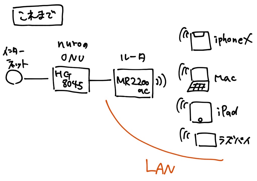 MR2200ac下にはいろいろなデバイスが吊るさっていて、このローカルLAN環境を維持したかったのです。ですので、iPadやMacにそれぞれ1台ずつテザリングすることは考えていませんでした。