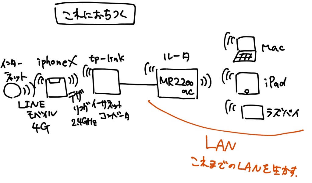 iPhoneテザリング(2.4GHz)をtp-link中継器で受けて、それを有線でMR2200acに接続し、そこからは無線です。