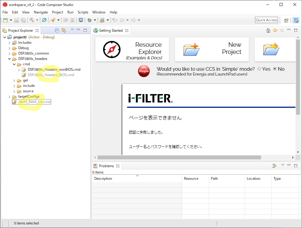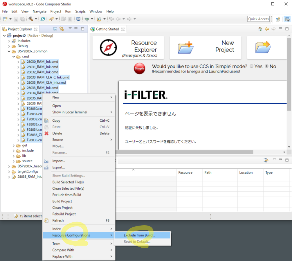 プロパティでマイコンの種類を変更すると自動的に28035_RAM_lnk.cmdのExcludeが解除されデバッグが失敗することがありました。そんなときは再度それをExcludeすれば通るようになります。