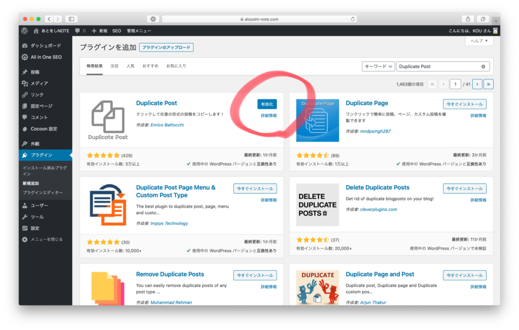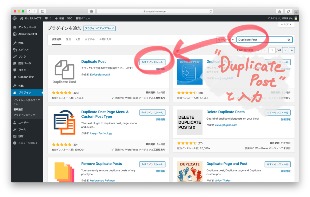 検索窓に「Duplicate Post」と入力し、「今すぐインストール」を選択