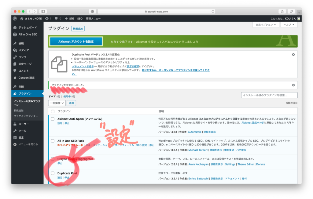 プラグインが有効化されました。「設定」を選択
