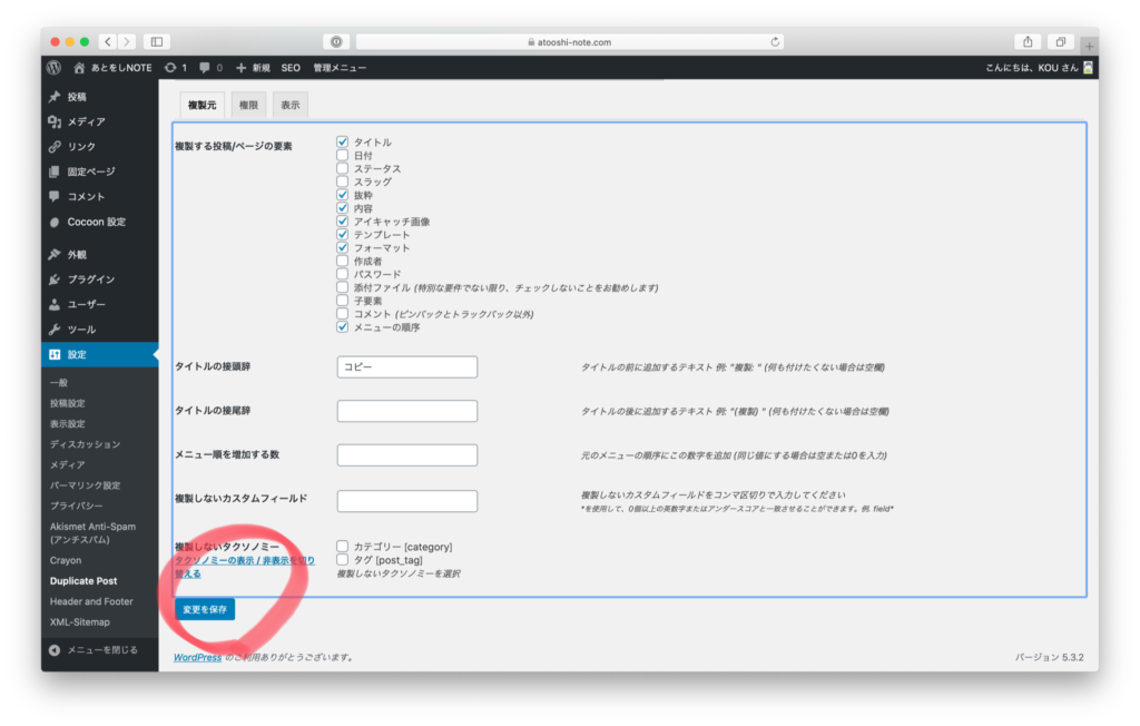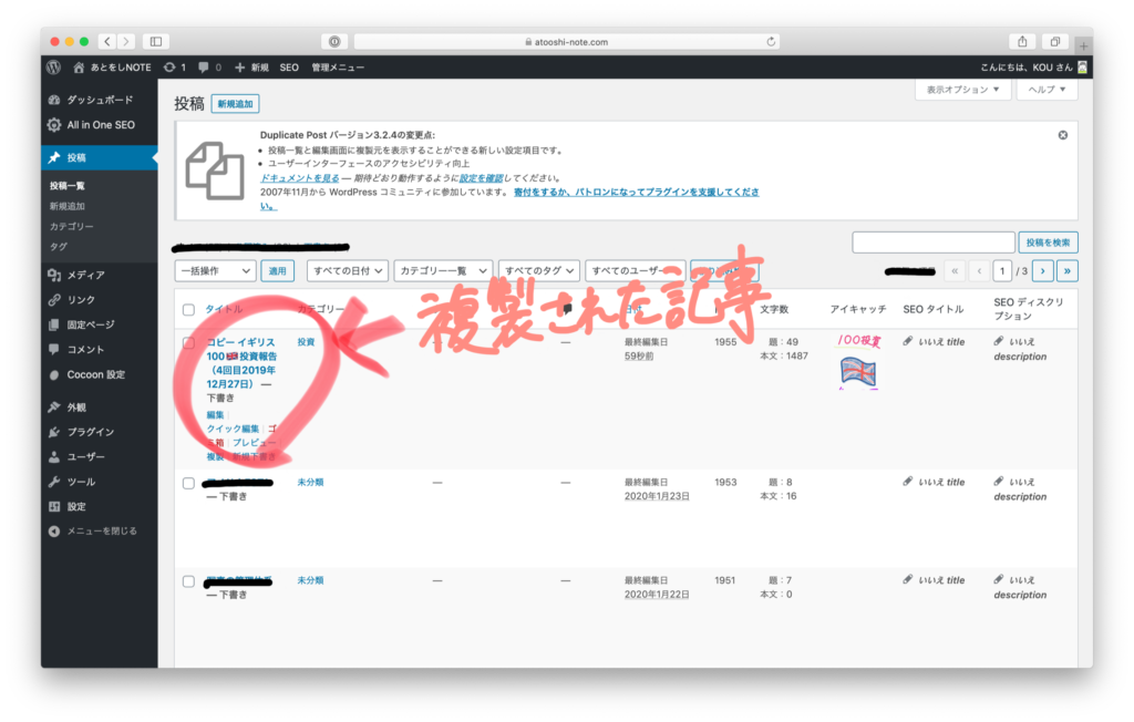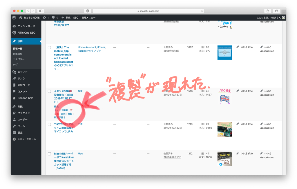 左メニューの「記事」から、例えば一つの記事を選択すると、「複製」が出現しました。