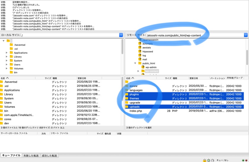 の配下にある、以下3つフォルダをFTPで自分のPCにダウンロードします。