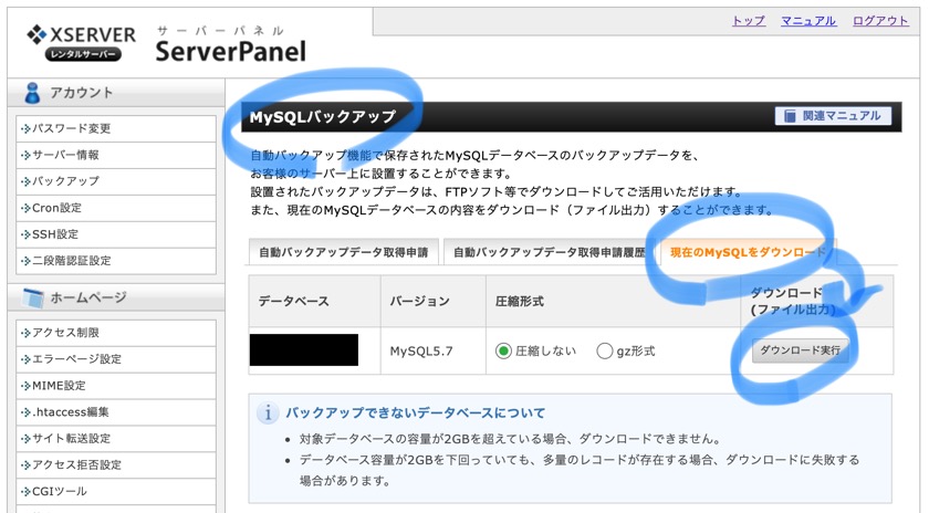 ですのでMySQLに問題があれば直前の自動バックアップからリストアすると思うので、ダウンロードは不要かもしれませんね。一応ダウンロード方法は以下に記載します(^^)