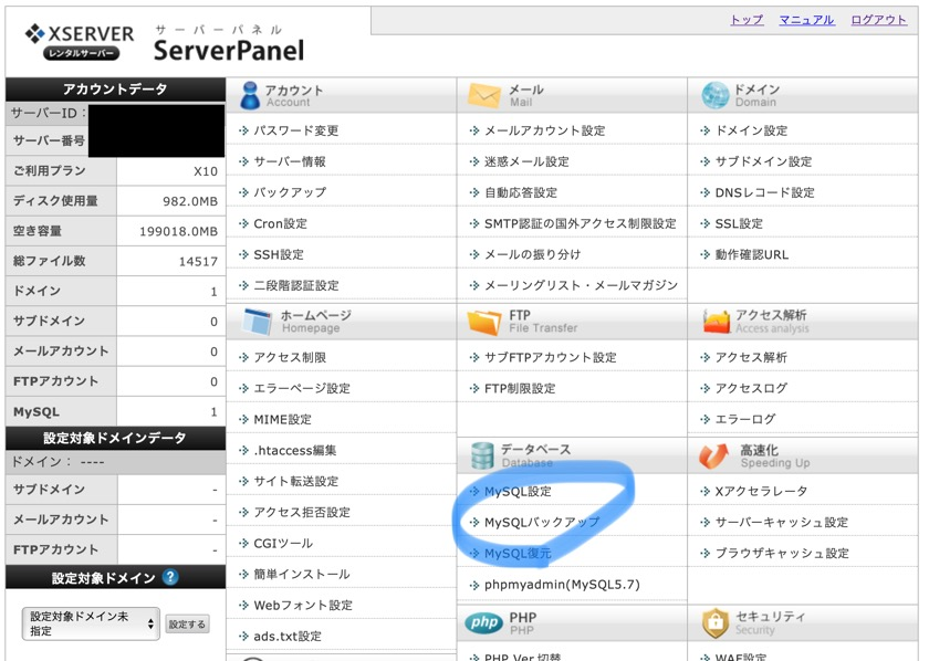 ただ、2.データベースはダウンロードはできますが、XserverでMySQL(データベース)の自動バックアップを行っていて、7日分だったら無料でリストアできるようです。