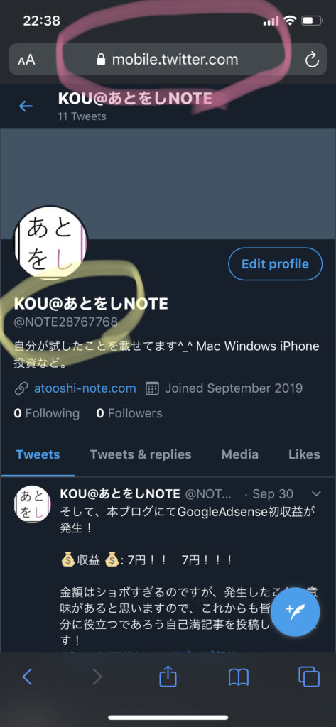 自分のTwitterであることは「@」以降で識別しています。(私の場合は「@NOTE28767768」です。(黄色丸部分))