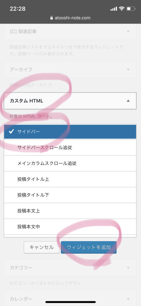 下にスクロールしていくと「カスタムHTML」の項目があるので、開き、「サイドバー」を選択して、「ウィジェットを追加」を押します。