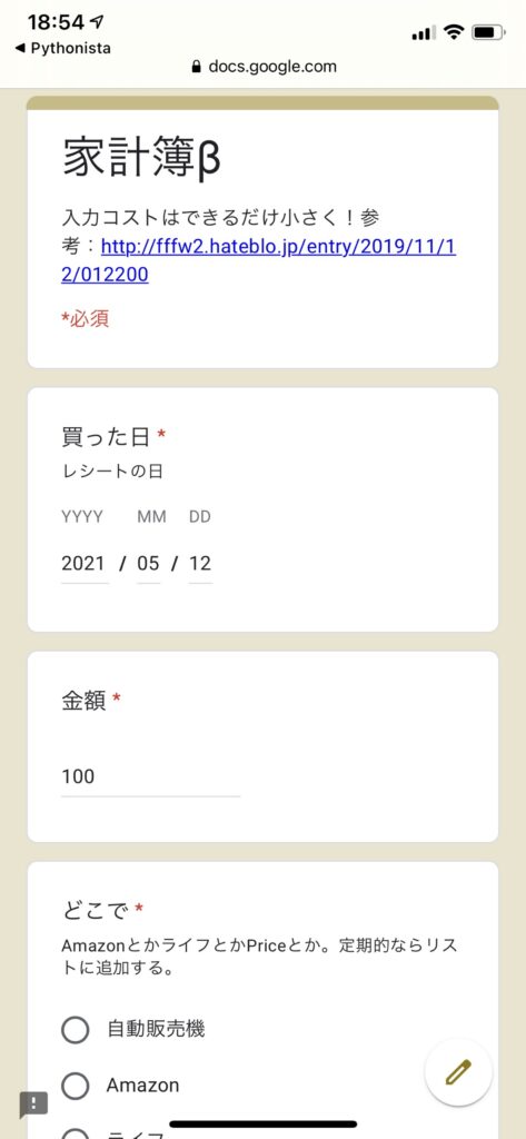 食費、金額などのカテゴリを変数にし(cateval,costvalなど)、ボタンが押された時に関数(def)で予め決めた値が入るようにして、できたURLパラメータをURLに整形してsafariでGoogleフォームを開いています。