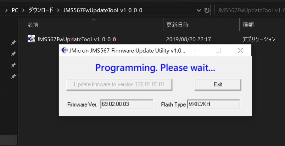 クリックすると”Programing. Please wait…”と表示されファームの書き換えを行なってくれます。