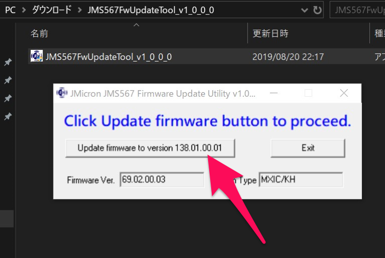 “Update firmware to version 138.01.00.01”と記載されたところをクリックします。