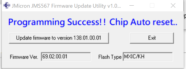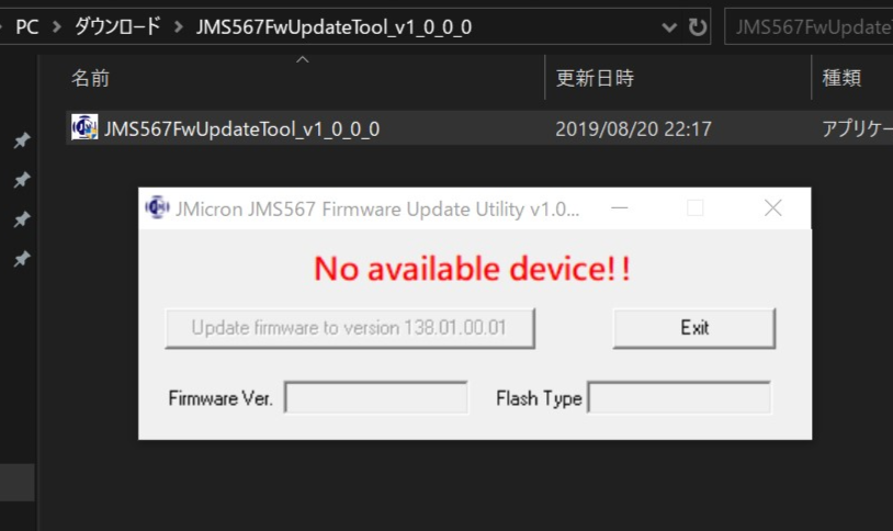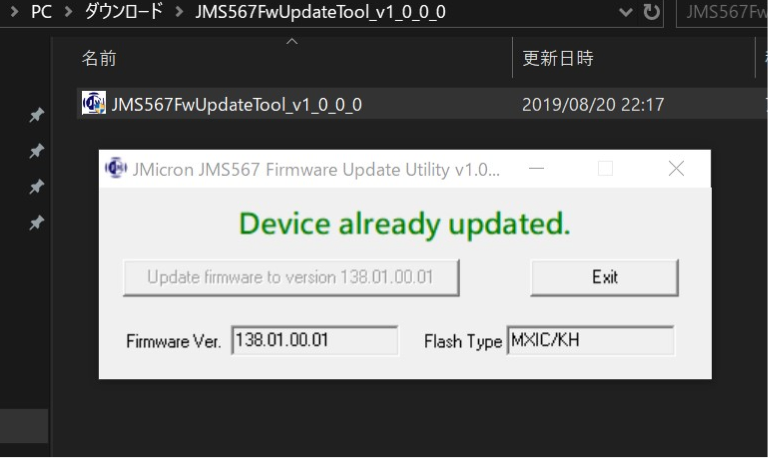 私の場合、”Device already updated.”が出る前に、”No available device!!”が頻繁に出てしましましたが、HDDケースの電源を入れ直してみたり、電源スイッチをオンのままUSBを抜き差ししてみたら解決しました!
