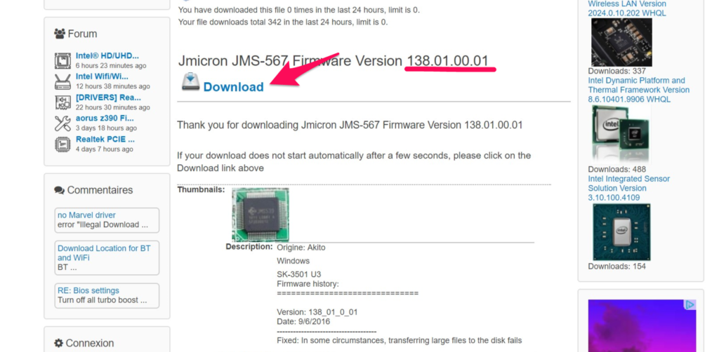 アクセスすると、”Jmicron JMS-567 Firmware Version 138.01.00.01″と書いてあるところがありますので、すぐ下の”Download”をクリックします。