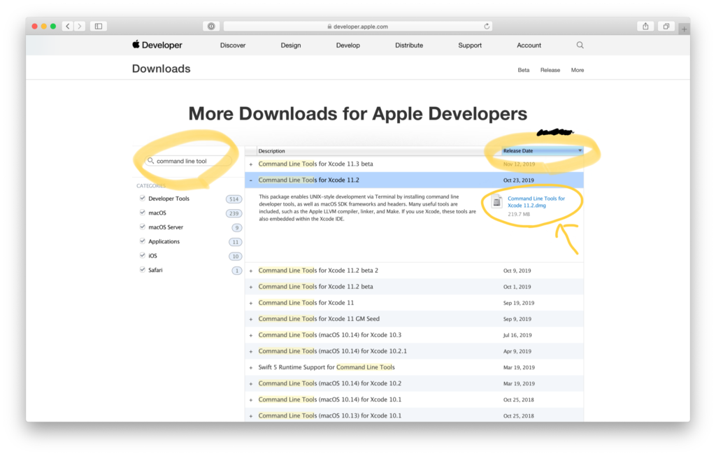 「開発」→「ダウンロード」→「MORE」と進み、検索ウィンドに「command line tool」と入力し、検索します。