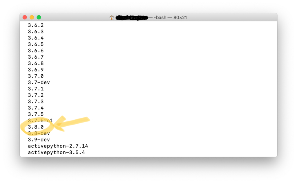 $ pyenv global 3.8.0としても、$ python –versionとするとPython 3.7.4のままです。どうやら、上にも書きましたが、Anaconda同封の3.7.4となってしまったようです。