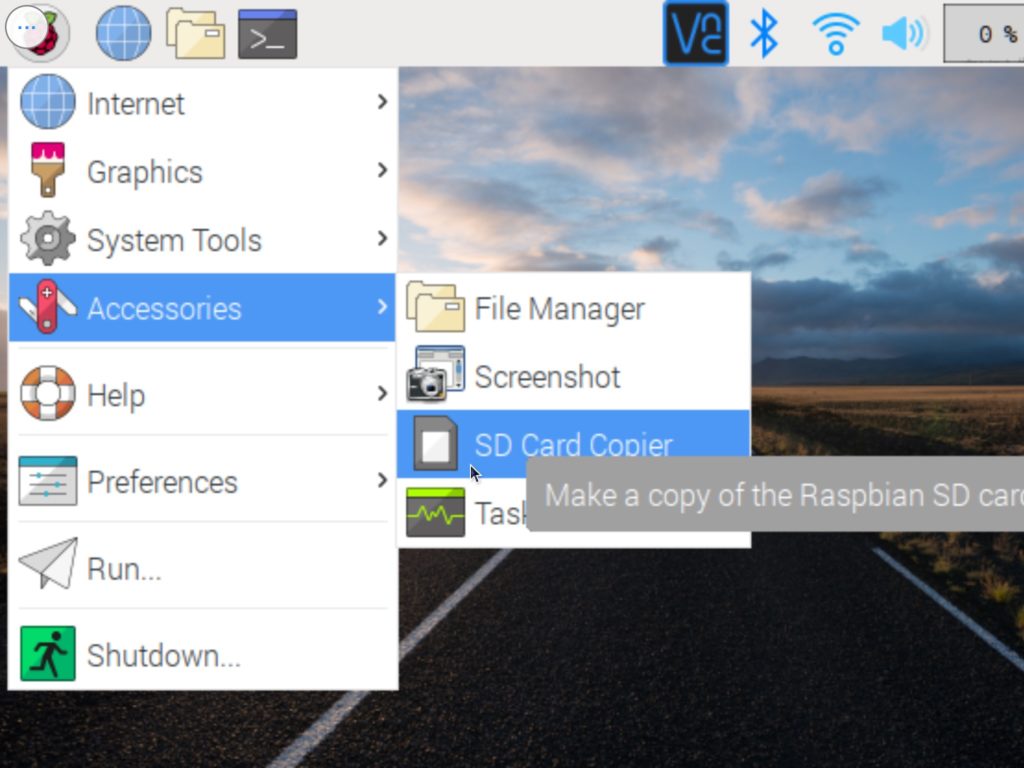 次に、SD Card Copierを開きます。元々デスクトップ環境を導入していれば、デスクトップの左上のラズパイマークから Accessories → SD Card Copier があります。