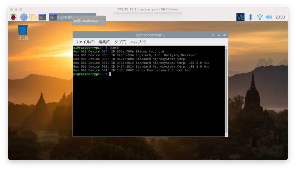 ラズパイでターミナルを開き、以下を入力してUSBデバイスをチェックします
