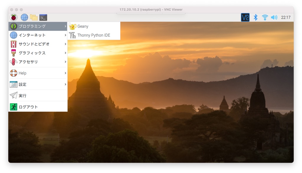 iPhoneは接続デバイスのipアドレスを確認する方法が無いので困りましたが、ラズパイにミニディスプレイを付けているので、USBマウスを操作してラズパイ上のVNCアプリを開いてラズパイに割り振られているipアドレスを確認しました(前回はAndroidを親機にしていました(ipアドレスとmacアドレスが表示されて便利))