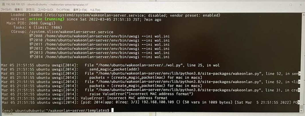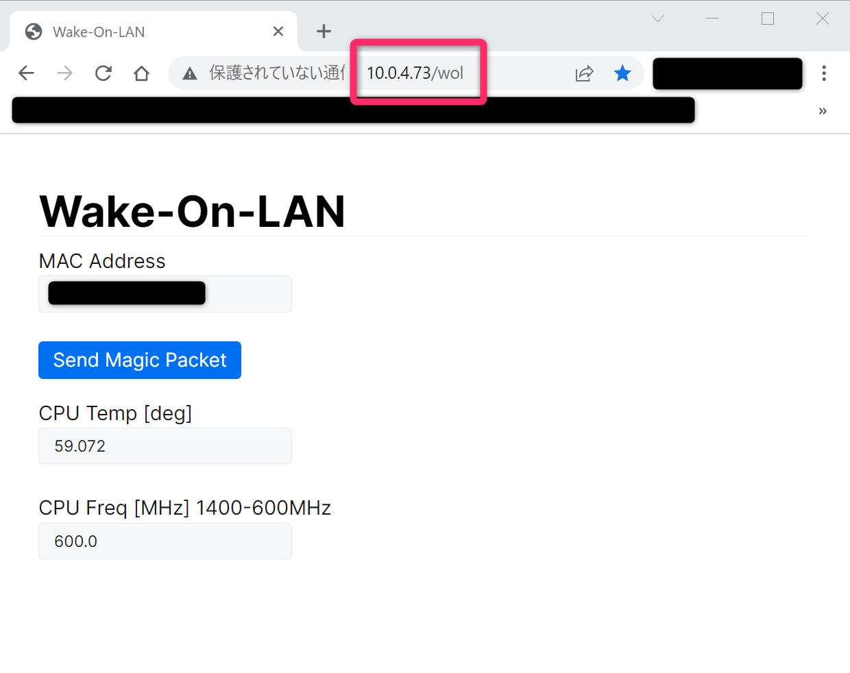 たぶんwol.htmlから変数(MACアドレス)をwol.pyに渡す時におかしくなってるのだが、検証できなかった