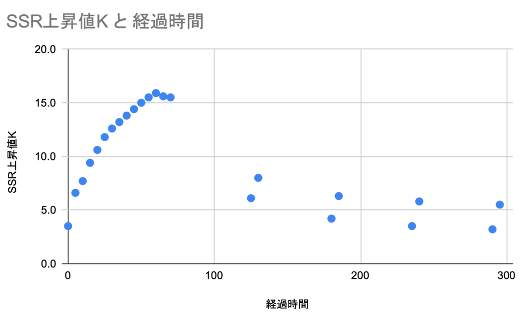 | SSR上昇値最大値 | 15.9K | 運転できる限界がわかる。 上昇最大値+室温がSSRの動作温度上限80℃を越えないように、負荷と時間を設定する。 |