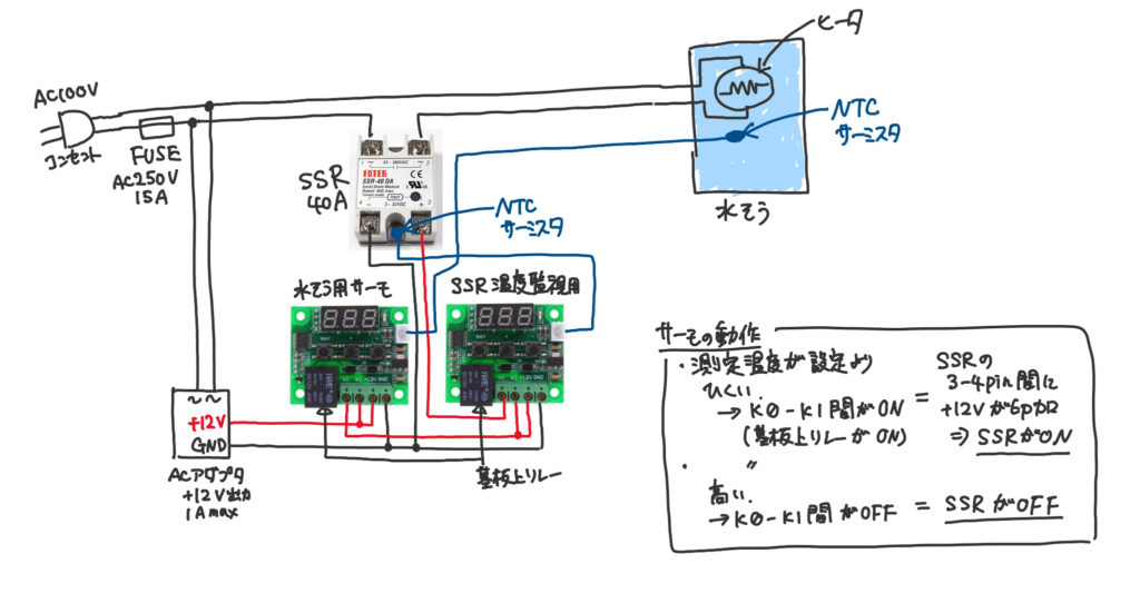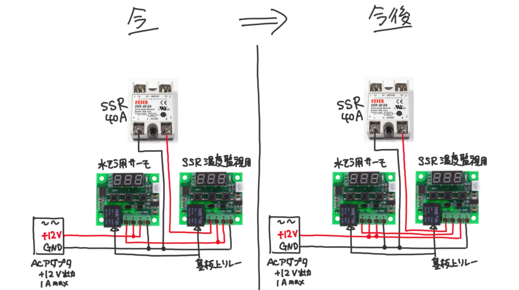 | 設定温度に達すると、水槽用サーモのリレーがOFFになるため、SSR温度監視用サーモの表示が消えてしまう(電源が断たれるため) → この時、SSRの温度はわからない(SSRはOFFなので、このわからない区間に過熱で壊す恐れはないが) → SSRの温度も常に表示したい | 各サーモに電源を供給する。 SSRへの電圧印加は各サーモのリレーが直列に入っているので、どちらがOFFしてもSSRはOFFできる(つまりSSRの動作は変わらない) → SSRの温度も常に表示される (普通こうするよね、うんわかる) |