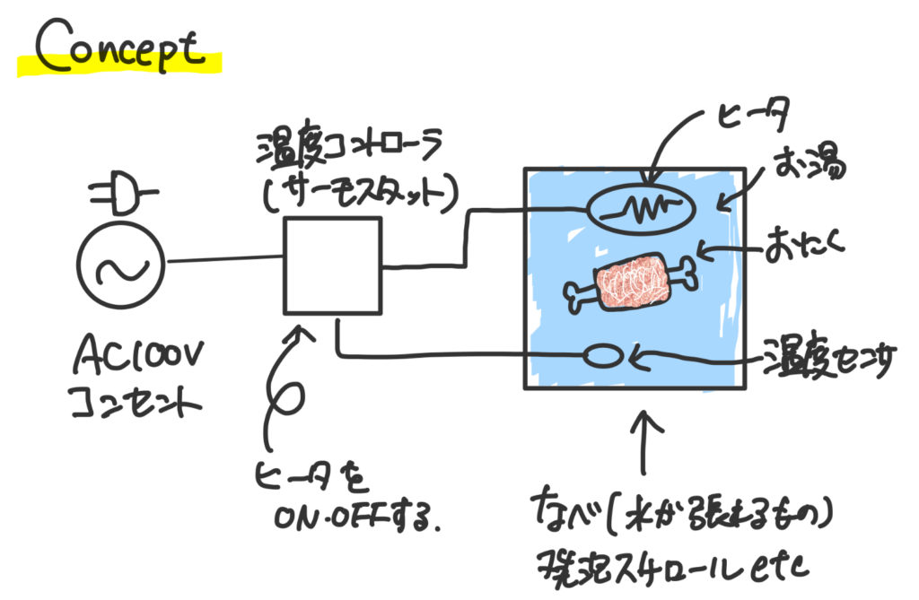 サーモスタット、水を温めるヒーター、水を入れる容器が必要ですね。