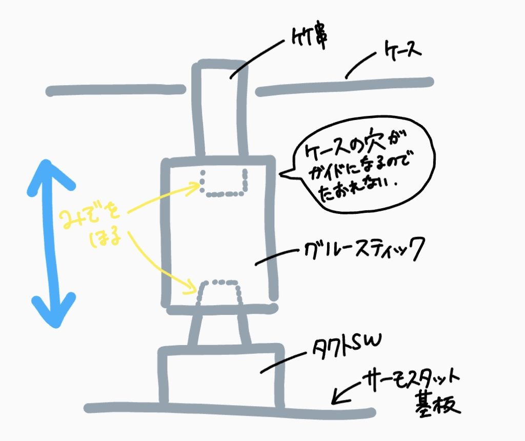 サーモスタットには支柱を立てて、ケース表面から1段下げた位置に固定しましたが、問題だったのはどうやってタクトスイッチ(3つ横並びのスイッチ)を押すか。