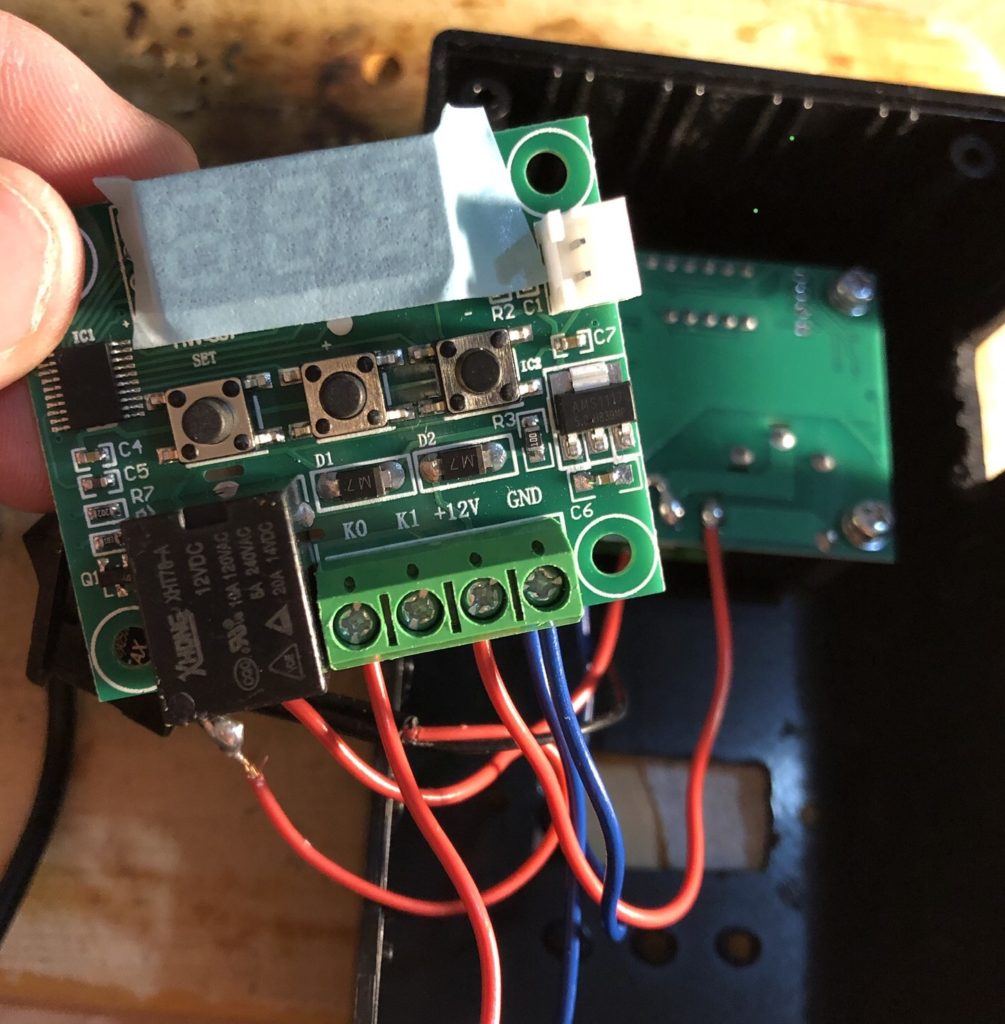 12Vでサーモスタット2台を駆動し、温度によってサーモスタット上のリレーを動作させ、SSRに12Vを供給するようにしています。