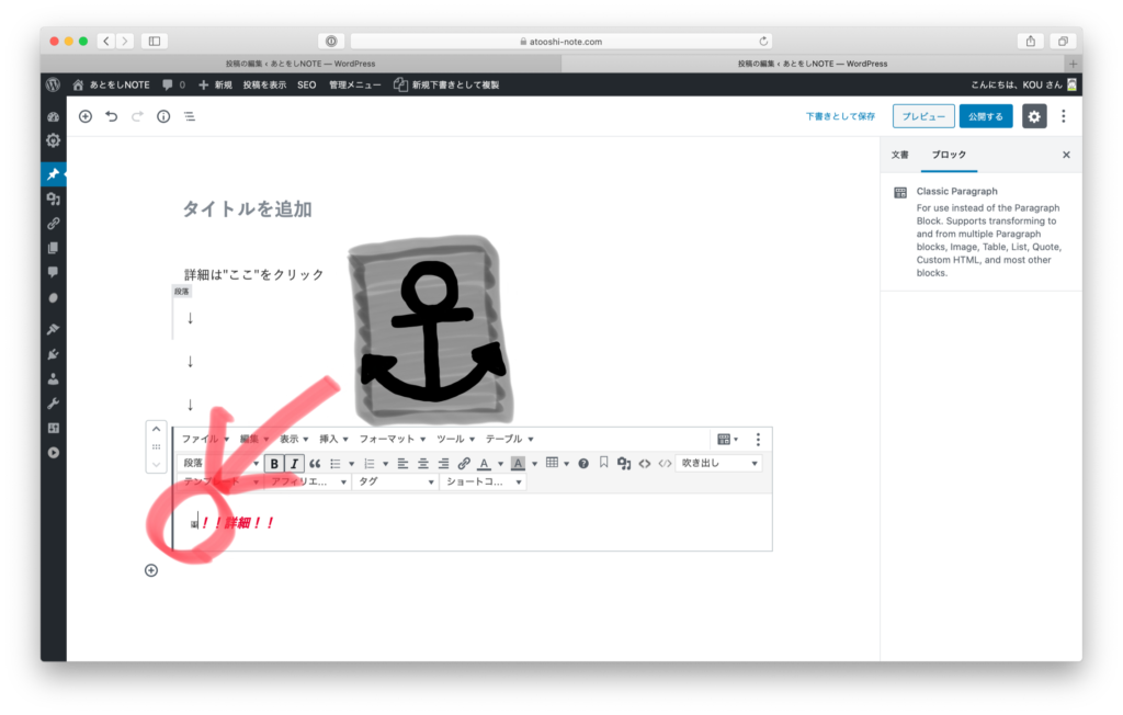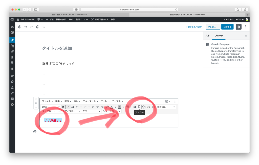 Classic Paragraphにしてから、「!!詳細!!」を選択し、「アンカー」をクリックします
