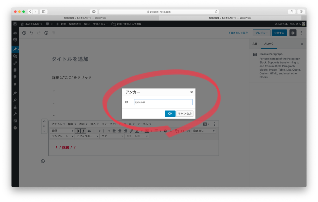 アンカーのIDを入力する画面が現れますので、ここで好きな文字列を入力します。ここでは syousai とします。