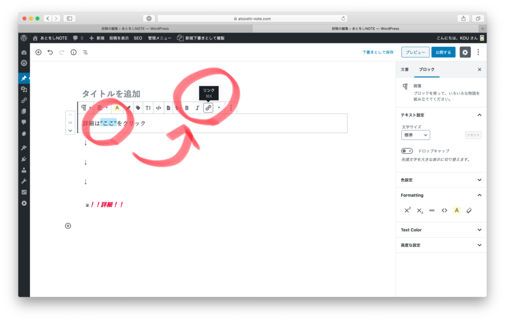 「”ここ”」を選択し、「リンク」をクリックします