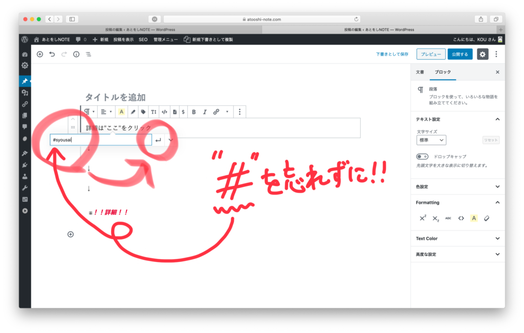 リンクを入力する窓が出ますので、先程のアンカーIDであるsyousaiを、先頭に#をつけて #syousai と入力し、エンターボタンをクリックします