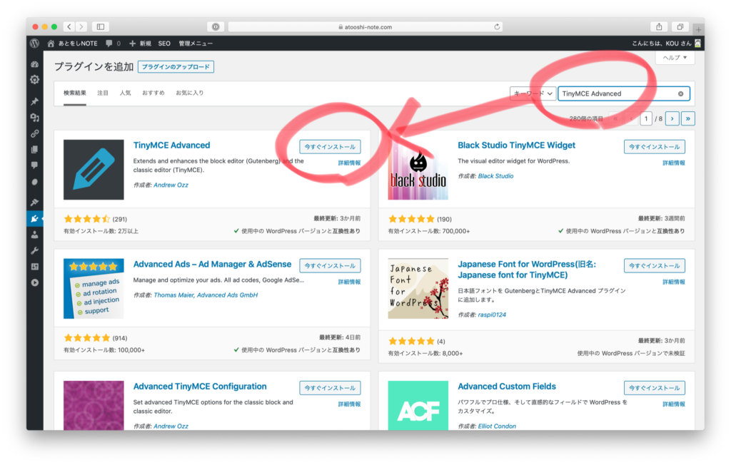 検索窓に TinyMCE Advanced と入力し、「今すぐインストール」をクリック