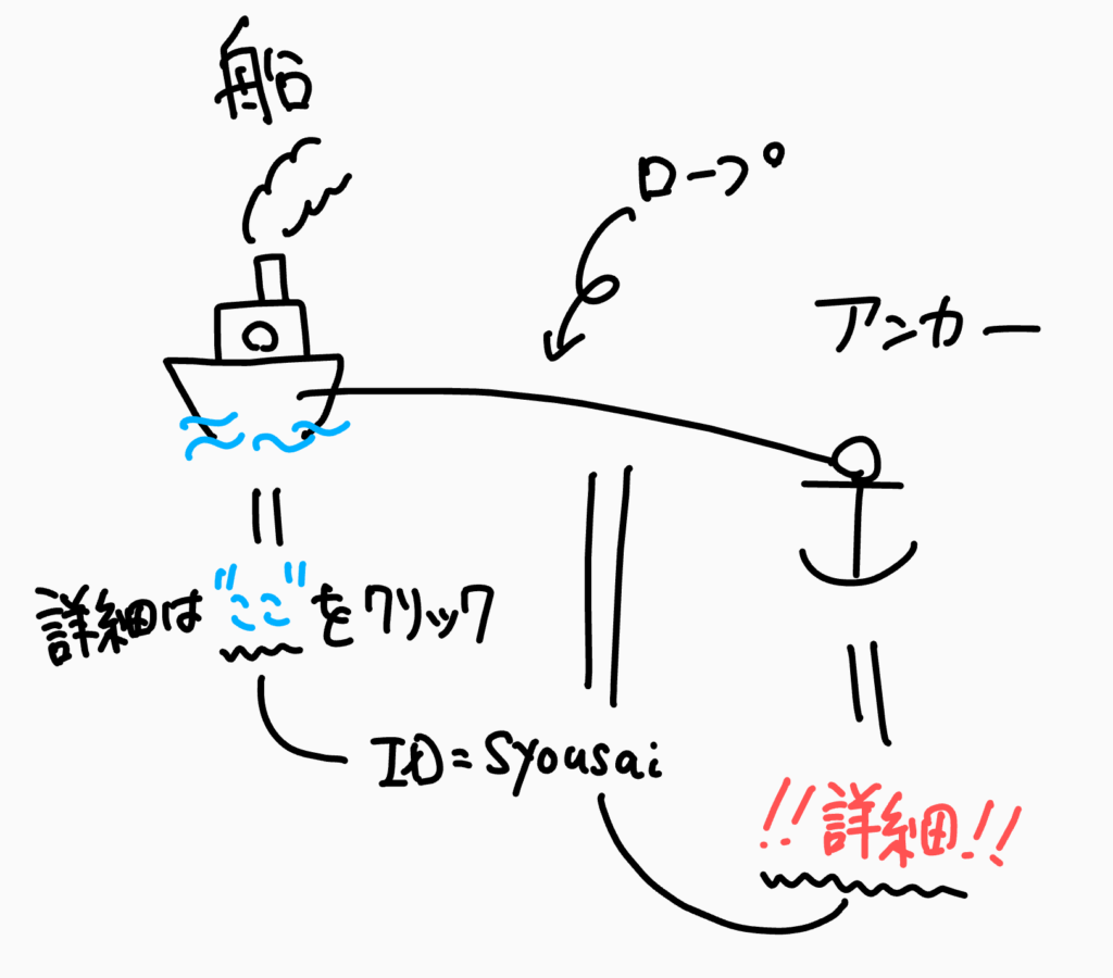 ページ内リンク(アンカーリンク)も考えは同じで、ジャンプ先(=いかりを打った場所)にロープ(=id)をたどって、辿り着く、ような感じです(^^)