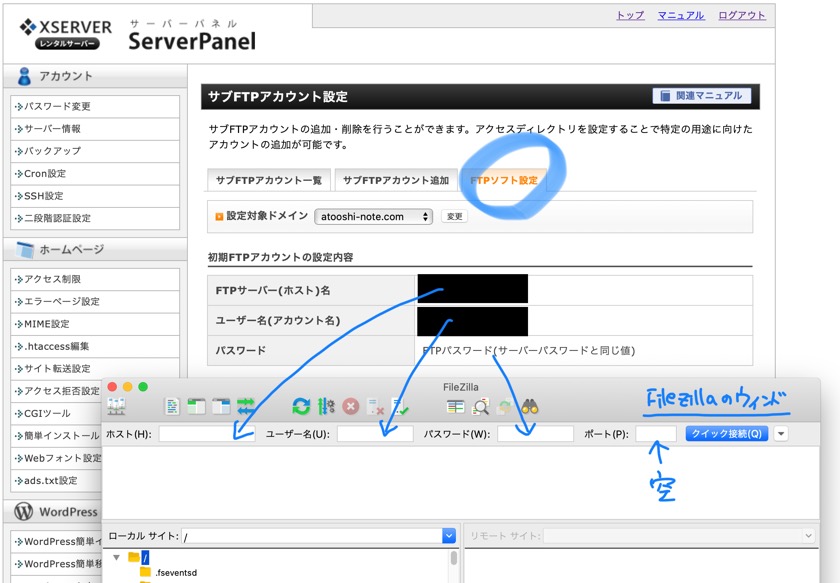 Xserver以外をお使いの方は、「使っているサーバー名 + FTP」 などでググれば方法が見つかると思います。