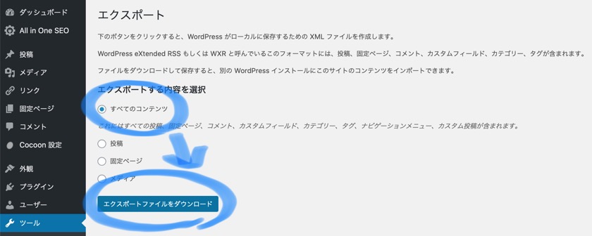 1のデータファイルはFTPでダウンロード、2のデータベースはwordpressの管理画面からダウンロードします。