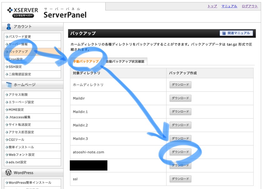 続いて、Xserverの管理画面から丸ごとダウンロードする方法を紹介します(^^)