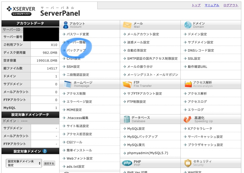 ただ、2.データベースはダウンロードはできますが、XserverでMySQL(データベース)の自動バックアップを行っていて、7日分だったら無料でリストアできるようです。